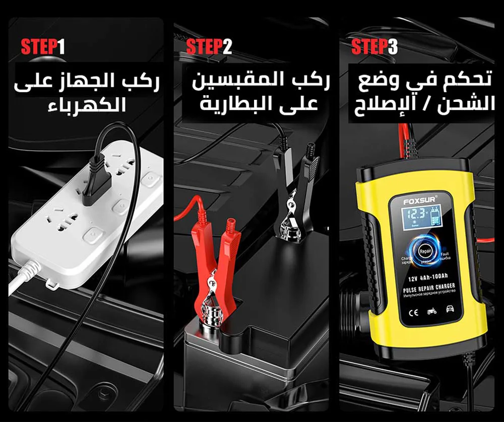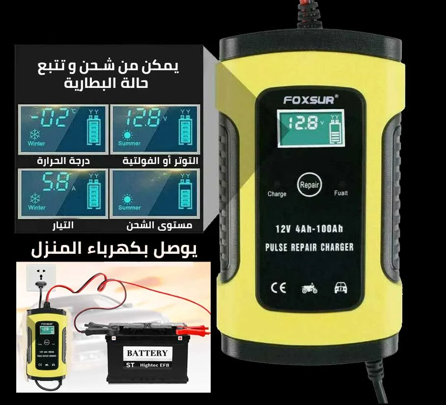 شاحن البطارية الذكي FOXSUR هو الحل الأقوى لمشكلة نفاد أو ضعف البطارية، سواء لسيارتك، دراجتك، شاحنتك أو حتى معدات الحديقة. بفضل تكنولوجيا Pulse Repair يقوم الجهاز بإصلاح البطارية، رفع كفاءتها، وشحنها بسرعة وأمان.